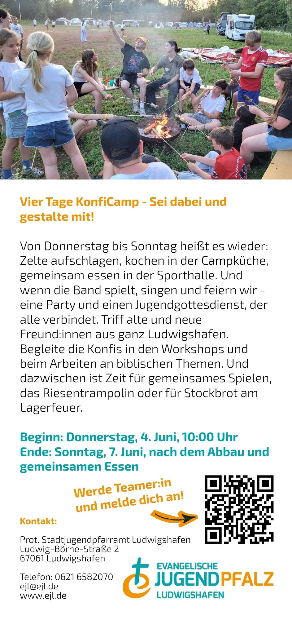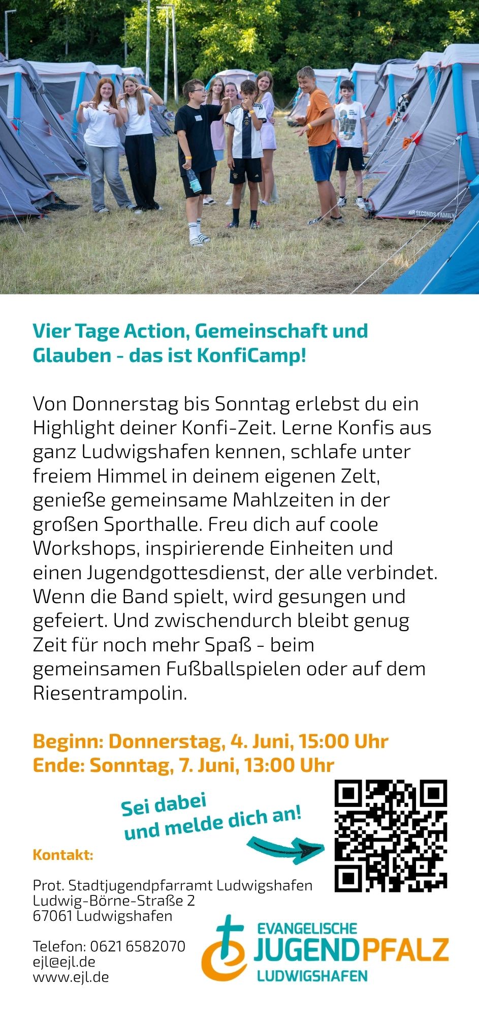 Von Donnerstag bis Sonntag (Fronleichnam) erlebst du ein Highlight deiner Konfi-Zeit. Lerne Konfis aus ganz Ludwigshafen kennen, schlafe unter freiem Himmel in deinem eigenen Zelt, genieße gemeinsame Mahlzeiten in der großen Sporthalle. Freu dich auf coole Workshops, inspirierende Einheiten und einen Jugendgottesdienst, der alle verbindet. Wenn die Band spielt, wird gesungen und gefeiert. Und zwischendurch bleibt genug Zeit für noch mehr Spaß - beim gemeinsamen Fußballspielen oder auf dem Riesentrampolin.